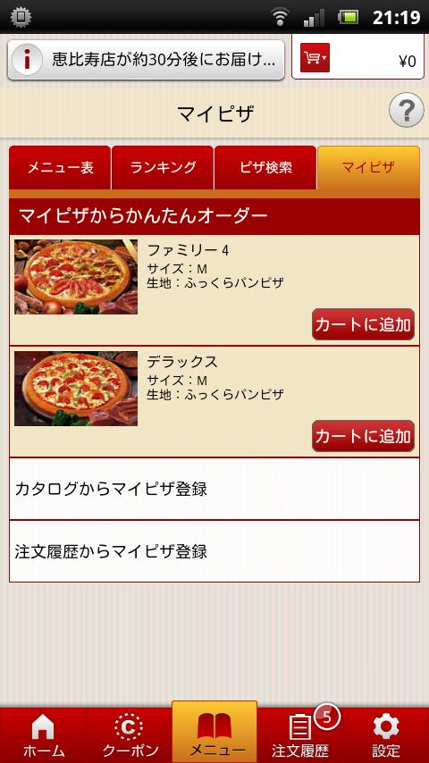 - マイピザを登録しておけばいつも頼むピザを超簡単に頼めちゃう