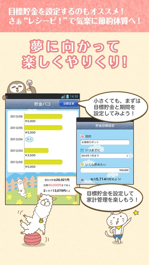目標貯蓄設定やカレンダー機能に加え、かわいいキャラクターがアナタをサポートしてくれます。