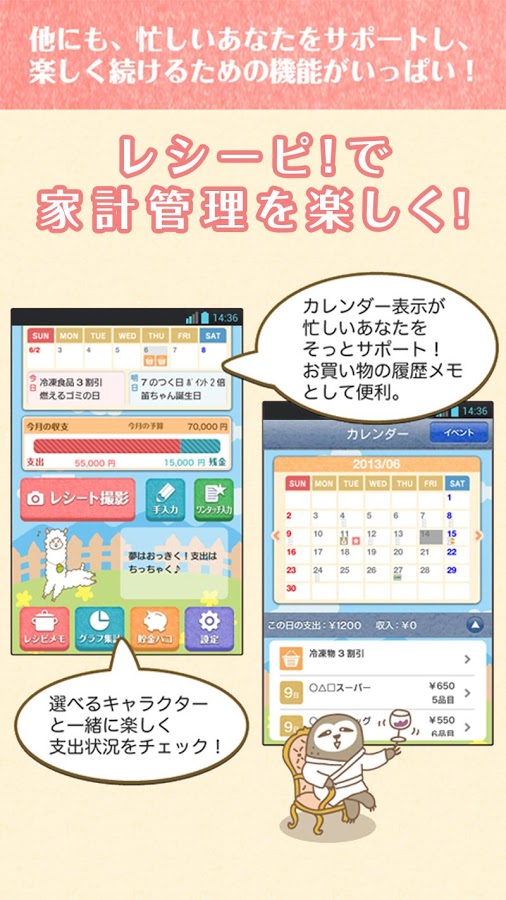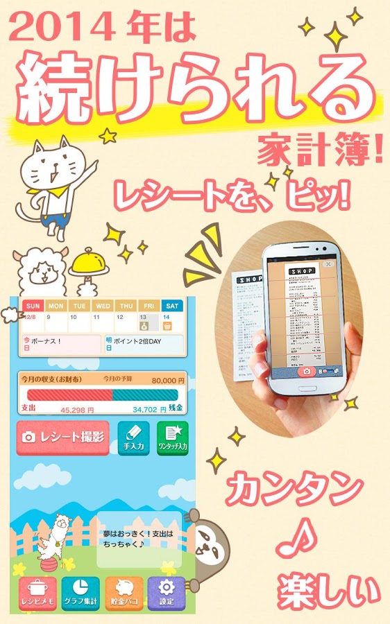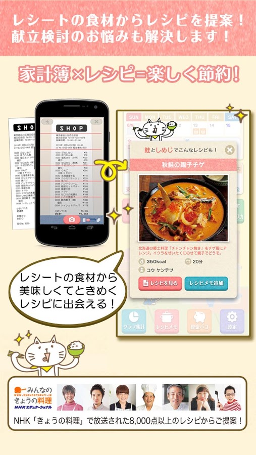 可愛いキャラクタースキンの楽チン家計簿 - 家計簿レシーピ!レシート撮影&節約レシピ提案で簡単に支出管理